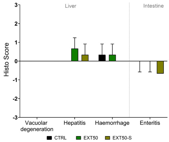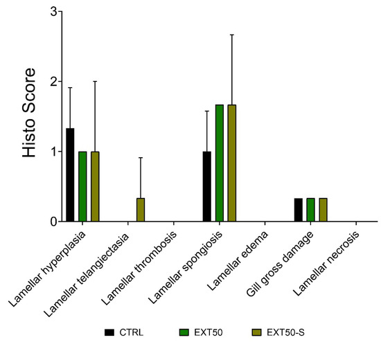 Histological scores in Atlantic salmon gills before and after 72 h exposure to the anesthetic extract did not differ significantly between groups, indicating that neither exposure to the extract nor to stress produced damage in the gill tissue (Figure 5). Fish in all groups presented lamellar hyperplasia, lamellar spongiosis, and to a lesser degree (lower score) general gross histological alterations of the gills (e.g., hyperplasia, lamellar fusion). These were not altered by exposure to the anesthetic nor to stress. The same was observed in the liver and intestines, as there were no differences in the histological score between groups (Figure 6).