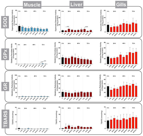 Liver, gill, and muscle from each specimen were thawed and 100 mg were dissected in an ice-cold environment and placed in a 2 mL tube with 1 mL of ice-cold 100 mM Phosphate buffer (pH 7.4). The tissues were then sonicated in ice until complete homogenization. The mixture was centrifuged at 10,000× g and 4 °C, and the supernatant was stored at −20 °C until analysis. The specific activities of superoxide dismutase, glutathione reductase, glutathione peroxidase, as well as lipid peroxidation in liver, gill and muscle, were assessed to evaluate oxidative stress throughout exposure to the algal extract, using commercial kits (#706002, #703202, #703102, and #700870 respectively, Cayman Chemical, Ann Arbor, MI, USA). Activities were normalized with tissue extract total proteins measured using a modified Lowry Protein Assay kit (Pierce, Thermofisher, Waltham, MA, USA) following the manufacturer’s instructions. All spectrophotometric analyses were performed using a Synergy H1 spectrophotometer (BioTek, Winooski, VT, USA).