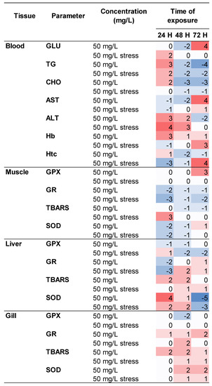 Heat map of overall modulation in mean scores over time within the various categories of the parameters analyzed in blood, muscle, liver and gill of juvenile Atlantic salmon exposed for 72 h to a microalga-derived anesthetic extract (50 mg L−1).