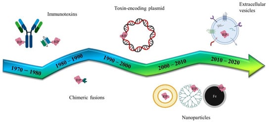 Some of these enzymes have been extensively studied in the past as toxic components of chimeric proteins called immunotoxins (ITXs) [16,17], made of a chemical or recombinant fusion between the toxin or toxic active domain and a targeting antibody or ligand binding domain. Note that, within the scope of this review, the term “immunotoxin” will be also used to indicate a broader type of chimeric toxins whose targeted domains are not exclusively made by antibodies. We recently placed emphasis on the advantages and disadvantages in the selection of ITX design and hosts for expression of chimeric protein toxins and use of recombinant immunotoxins [18]. The initial attempts to produce ITXs were associated to high costs of fully recombinant proteins and the related immunogenicity issues observed in treated patients as well as the risk of vascular-leak syndrome; furthermore, constraints due to low efficiency in cytosolic entry pathways of the toxin domains (where the target ribosomes are) were clearly observed. These issues led already in the nineties to the exploration of alternative gene delivery approaches, using selected toxic domains from potent inhibitors of protein synthesis, such as plant RIPs, or bacterial toxin. Active domains derived from Corynebacterium diphtheriae (DT-A) or Pseudomonas aeruginosa (ETA) moreover can act in a cell-cycle independent way, being thus able to kill both quiescent (i.e., tumor stem cells) and rapidly dividing cancer cells.
