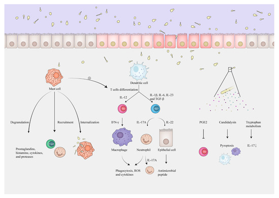 For immunocytes, mouse models show that the degranulation of mast cells is triggered by β-glucans of C. albicans, likely through the Dectin-1 pathway, to release prostaglandins, histamine, cytokines, and specific proteases (β-hexosaminidase and tryptase) [16]. Meanwhile, an in vitro study shows that mast cells have versatile and timed responses when encountering C. albicans [53]. Initially, mast cells degranulate to release β-hexosaminidase and reduce C. albicans viability. Then, they release IL-8 and recruit neutrophils. In the final response, IL-16 is released, and mast cell extracellular traps ensnare C. albicans, along with observed T-cell migration (Figure 2).
