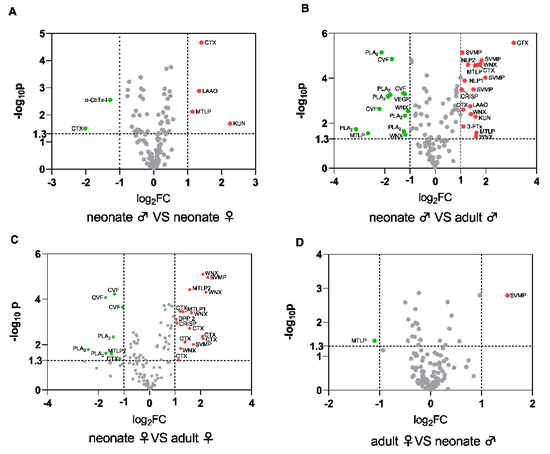 The relative differences of N. atra venomic groups. (A) Neonate males versus neonate females. (B) Neonate males versus adult males. (C) Neonate females versus adult females. (D) Adult females versus adult males. The red dots represent the upregulated and green dots present the downregulated proteins. p < 0.05(−log10 p > 1.3), |log2FoldChange| > 1. Abbreviations: 3-FTX, three-finger toxins; CRISP, cysteine-rich secretory protein; SVMP, snake venom metalloproteinase; CVF, cobra venom factor; PDE, phosphodiesterase; NGF, nerve growth factor; AChE, acetylcholinesterase; PLA2, phospholipase A2; NP, natriuretic peptide; VESP, vespryns; KUN, kunitz-type inhibitor; CTL, C-type lectin; 5′-NT, 5′-nucleotidase; QC, glutaminyl-peptide cyclotransferases; PLI, phospholipase A2 inhibitor; SVSP, snake venom serine protease; LAAO, L-amino acid oxidase; VEGF, vascular endothelial growth factor; DPP, dipeptidylpeptidase; HAase, hyaluronidase; PLB, phospholipase B; CTX, cytotoxin; WNX, weak neurotoxin; α-CbTx-I, type I alpha-neurotoxin (short neurotoxin, SNX); MTLP, Muscarinic toxin-like protein; NLP, neurotoxin like protein.