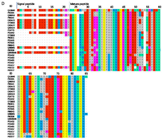 N. atra 3-FTx sequence alignment analysis. LNX (long neurotoxin) (A). WNX (weak neurotoxin) (B). SNX (short neurotoxin) (C). CTX (cytotoxin) (D). ID: the ID number of the protein in Uniprot. Online multi-sequence alignment by MAFFT Version 7, parameter default value.