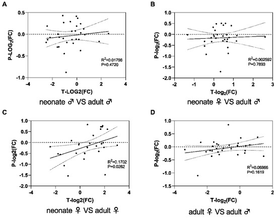 The correlation analysis of the proteome and venom gland transcriptome of N. atra venom. Neonate males versus adult males (A); neonate females versus neonate males (B); neonate females versus adult females (C); adult females versus adult males (D). T: transcript; P: protein; FC: fold change; R2: Pearson R squared.