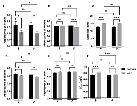 The enzyme activities of N. atra crude venom. SVMP (A); LAAO (B); PLA2 (C); 5′-NT (D); AChE (E); LD50 (F). ♀: female; ♂: male. Significance analyzed by Tukey’s multiple comparison test, the value of p > 0.05 (ns), p < 0.05 (*), p < 0.002 (**), p < 0.001 (***).