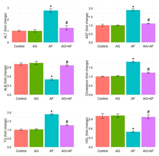 Bar plot panel of liver biochemical parameters and lipid profile upon AF and/or AG treatment. Values shown are mean ± SE (n = 5). ALB, albumin; ALT, alanine aminotransferase; AST, aspartate aminotransferase; HDL, high-density lipoprotein; TG, triglyceride. p < 0.01; * AF vs control; # AG+AF vs AF.