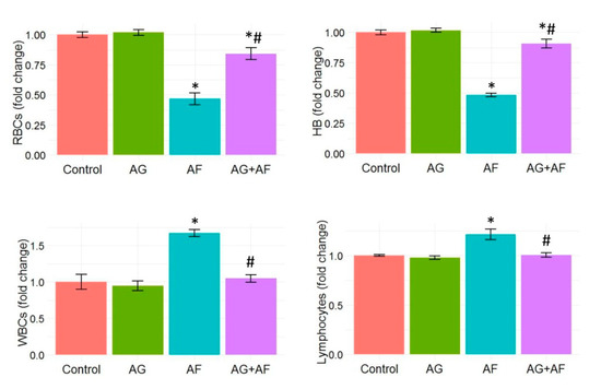 Bar plot panel of hematological profile upon AF and/or AG treatment. Values shown are mean ± SE (n = 5). RBC, red blood cells; HB, hemoglobin; and WBCs, white blood cells. p < 0.01; * AF vs control; # AG+AF vs AF.