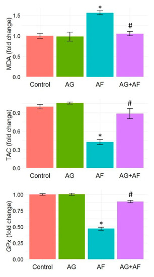Bar plot panel of plasma antioxidant and peroxidation biomarkers changes upon AF and/or AG treatment. Values shown are mean ± SE (n = 5). GPx, glutathione peroxidase, MDA, malondialdehyde; TAC, total antioxidant capacity. p < 0.01; * AF vs control; # AG+AF vs AF.