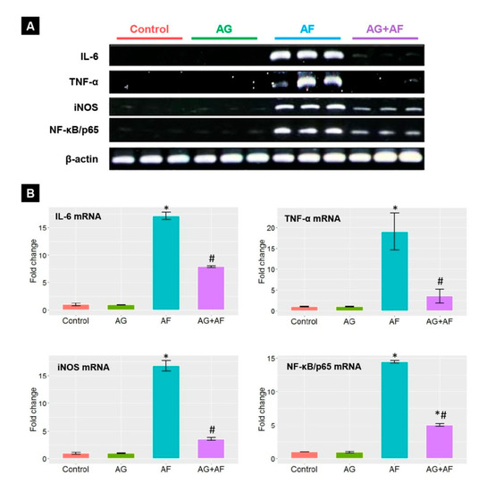 The mRNA expression of proinflammatory cytokines in liver upon AF and/or AG treatment. (A) representative bands for IL-6, TNF-α, iNOS, NF-κB/p65, and β-actin genes; (B) Bar plot panel of the semiquantitative analysis of mRNA levels of proinflammatory cytokines after normalization against β-actin. p < 0.01; * AF vs control; # AG+AF vs AF.