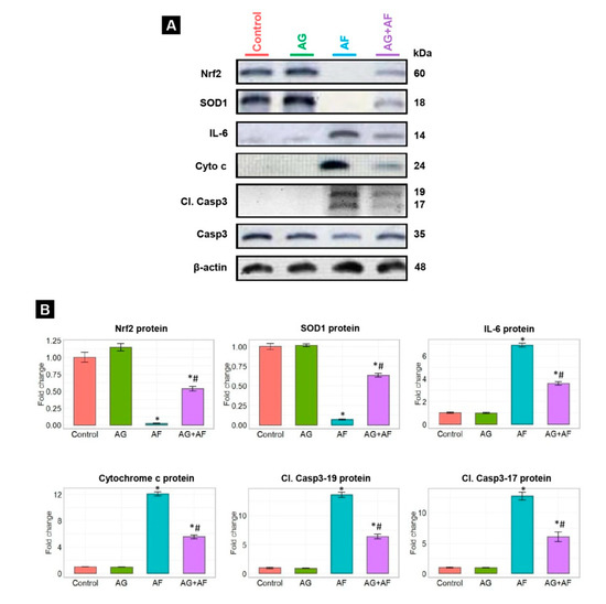 Protein expression of inflammatory cytokine, antioxidant, and apoptotic proteins in liver upon AF and/or AG treatment. (A) Typical immunoblots for IL-6, Nrf2, SOD1, Cyto c, Cl. Casp3-17/19, Casp3, and β-actin proteins; (B) Bar plot panel for semiquantitative data were created from immunoblot after normalization against β-actin. p < 0.01; * AF vs control; # AG+AF vs AF.