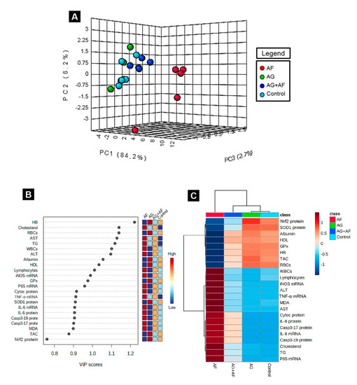 Next, to uncover the relationships between different treatments and variables, PCA was conducted. The PCA showed that all variables were incorporated into three main principal dimensional components (PC1, PC2, and PC3), accounting for 93.1% of the total variance. Most of the examined variables were distinguished by PC1, and hence described the greater proportion of variance (84,2%), whereas the lower proportion of variance was reflected by PC2 (6.2%) and PC3 (2.7%). The PCA revealed that the Control, AG, and AG+AF groups were clustered together on the left side of the gel and segregated from those treated with AF (mainly along the PC1 dimension; Figure 6A). Moreover, the variable importance in projection (VIP) indicated that cholesterol, TG, AST, ALT, WBCs, lymphocytes, MDA, iNOS mRNA, NF-κB/p65 mRNA, TNF-α mRNA, IL-6 mRNA, Casp3 protein, Cyto c protein, and IL-6 protein were the most influential variables in the discrimination of AF-treated animals from the rest (Figure 6B). The clustering heatmap illustrated in Figure 6C provides an intuitive visualization of all the data sets, which summarizes the marked difference between the concentration values of all measured parameters in response to AF toxicity compared to the other treated groups. These findings demonstrate that the AF-exposed animals showed more damage than animals in the other groups.