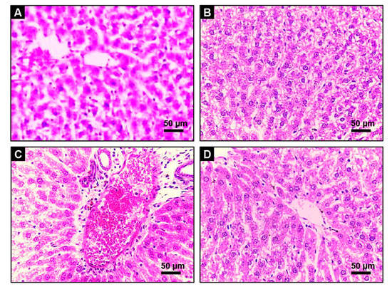 The harvested liver tissue sample was fixed in 10% formalin for 24 h. Next, the specimen was washed under running tap water for ten minutes and soaked in sequent dilutions of ethanol (70, 80, 95, and 100%) to dehydrate. Following dehydration and before being embedded in paraffin, samples were cleared in xylene. The prepared blocks were sliced into 4 μm thick sections using a microtome. Then, all sections were stained with hematoxylin and eosin (H&E) for screening and images, using a camera integrated digital imaging system (DM300, Leica, Wetzlar, Germany).