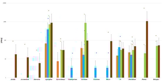 Samples were suspended in 45 ± 2% mL of sterile dilution fluid prepared according to PN EN ISO 6887-1, July 2000, consisting of: enzymatic casein hydrolysate—1 g, sodium chloride—8.5 g and distilled water—1000 mL, pH 7.0 ± 0.2, and homogenized for 90 s. The samples were resuspended in 45 ± 2% mL of sterile dilution fluid, prepared according to PN EN ISO 6887-1, July 2000, consisting of: enzymatic casein hydrolysate—1 g, sodium chloride—8.5 g and distilled water—1000 mL, pH 7.0 ± 0.2, and homogenized for 90 s. The total number of fungi was determined according to ISO 7954, September 1999, with modifications (1 mL surface culture, 0.1 mL in triplicate). The homogenized initial suspension (material a diluted 1:10) was diluted. The surface culture according Koch was performed on YGC (yeast extract, chloramphenicol, glucose) medium with the following composition: yeast extract—5 g, chloramphenicol—0.1 g, glucose—20 g, agar—15 g, distilled water—1000 mL, pH 6.6. The incubation was carried out for 5 to 7 days (10–14 in the case of filamentous fungi) at the specified temperature of 25 °C ± 1 °C. At the end of the incubation period, colonies were counted with a range not exceeding 10 to 100 colonies per gram. Separation into molds and yeasts was done on the basis of microscopic preparations. The results were expressed as the number of colony-forming units per gram of each sample [cfu/g] of fungi (filamentous fungi plus yeasts). Direct microscopic examination of colonies cultured from YGC agar was carried out on wet Amman’s lactophenol medium, according to the Polish Standard PN R-64791:1994 (1994) (Amman’s lactophenol: crystalline phenol—10 g, lactic acid—10 g, glycerol—20 g, distilled water—10 mL, methylene blue—0.5 g per 100 mL of lactophenol). Determination to genus was made using the Food and Indoor Fungi (Samson R.A.; Houbraken J.; Thrane U.; Frisvad J.C.; Andersen B) and Fungi and Food Spoilage (Pitt J.I.; Hocking A.D) keys.