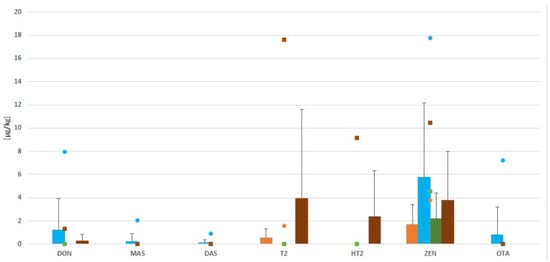 Levels of mycotoxin contamination in all samples. (Bars indicate means, lines indicate SD, and small symbols indicate the maximum level of mycotoxin. Colors indicate the source, with orange is for tablets (n = 2/4), blue for capsules (n = 6/9), green for dry raw material (n = 3/3), and brown for sachets (n = 4/5).