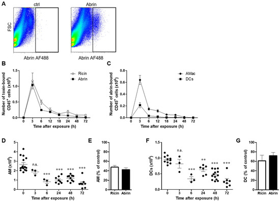 Kinetics of abrin binding to hematopoietic cells and alteration in cell populations in the lung. Mice were intranasally exposed to fluorescent abrin or ricin AF488 (20 or 14 µg/kg body weight, respectively), and lung cells were isolated at 3, 6, 12, 18, 24, 48 and 72 h after exposure and analyzed by flow cytometry for toxin binding by detection of AF488+ cells and different cell population counts in the lungs. (A) Dot plots represent abrin AF488 staining in lung cells isolated 3 h after abrin intoxication or in cells isolated from control mice. (B) Quantification of toxin-bound CD45+ cells at different time points following intoxication. A comparison between ricin and abrin intoxications (n = 3–9 mice in each group). (C) Quantification of abrin-bound AMs and DCs at different time points following abrin intoxication (n = 3–6 mice in each group). Quantification of AM (D) and DC (F) population sizes at different time points following abrin intoxication (10 µg/kg, n = 3–15 mice in each group; each point indicates individual mice). The results are depicted as the means ± SEMs. ** p < 0.01, *** p < 0.001 in comparison to nonintoxicated mice; n.s., not significant. Comparison between abrin and ricin [25] AMs (E) and DCs (G) (% of control) at 24 h postexposure to toxins.