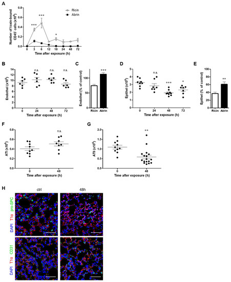 Kinetics of abrin binding to parenchymal cells and alteration in cell populations in the lung. Mice were intranasally exposed to fluorescent abrin or ricin AF488 (20 or 14 µg/kg body weight, respectively), and lung cells were isolated at 24, 48 and 72 h and analyzed by flow cytometry for toxin binding by detection of AF488+ cells and for different cell population counts in the lungs. (A) Quantification of toxin-bound CD45− cells at different time points following intoxication. Comparison between ricin and abrin intoxications (n = 3 mice per group). (B) Mice were intranasally exposed to abrin (10 µg/kg), lungs were removed at indicated time points, and endothelial and epithelial (D) numbers were determined by flow cytometry (n = 6–9 mice in each group). Comparison between the percent of endothelial (C) or epithelial (E) cells at 48 h post abrin exposure to the percent of these cells at the same time point after ricin intoxication [25]. (F) Quantification of alveolar epithelial type I (ATI) and alveolar epithelial type II (ATII) (G) cell populations at 48 h post abrin exposure (n = 8–17 mice in each group). (H) Immunofluorescence analysis of ATI (T1α, red) and ATII (pro-SPC, green) or endothelial cell (CD31, green) staining of lung tissue in nonintoxicated mice (control) versus abrin 48 h postexposed mice (blue, 4′,6-diamidino-2-phenylidole (DAPI) staining of nuclei). Scale bar: 50 µm. The results are depicted as the means ± SEMs. * p < 0.05, ** p < 0.01, *** p < 0.001; n.s., not significant. (A,C,E) Comparison between intoxications at each time point; (B,D,F,G) comparison with nonintoxicated mice.