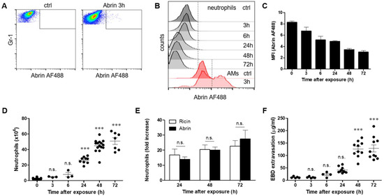 Effect of exposure to abrin on neutrophils and lung permeability. Mice were intranasally exposed to fluorescent abrin AF488 (20 µg/kg body weight), and lung cells were isolated at 3, 6, 24, 48 and 72 h and analyzed for neutrophils by flow cytometry. (A) Dot plots represent abrin AF488 staining in neutrophils isolated 3 h after abrin intoxication or in cells isolated from control mice. (B) Abrin AF488 binding to neutrophils (black histograms) and AMs (red histograms) at different time points following abrin intoxication. (AMs are autofluorescent in the lungs and exhibit high background in control mice.) (C) MFI of abrin AF488 binding to neutrophils (n = 3–7 mice in each group). (D) Neutrophil count in the lungs at different time points following abrin intoxication. (E) Comparison between the increase in neutrophils after abrin and ricin [25] intoxication (n = 3–15 mice in each group). (F) Lung EBD extravasation following abrin intoxication. Control or abrin-intoxicated mice were intravenously injected with 50 mg/kg EBD at the indicated time points, and lungs were monitored for EBD content (n = 4–10 mice in each group). The results are depicted as the means ± SEMs. *** p < 0.001; n.s., not significant. In (D,F), comparison with nonintoxicated mice.