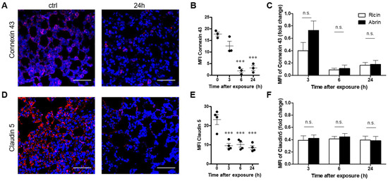 Alterations in connexin 43 and claudin 5 in the lungs of abrin-intoxicated mice. Lungs of abrin-intoxicated (10 µg/kg body weight) mice were harvested at the indicated time points, and junction proteins were quantified by immunohistochemical analysis of lung sections. (A,D) Confocal microscopy scans of lung sections stained for connexin 43 and claudin 5 (red) and identification of nuclei by DAPI (blue). (B,E) Scatterplots represent the immunofluorescence staining intensities of connexin 43 and claudin 5, expressed as MFI (n = 3–4 mice in each group). Scale bar: 50 µm. (C,F) Comparison between the abrin- and ricin-induced reduction in connexin 43 and claudin 5 [27]. The results are depicted as the means ± SEMs. *** p < 0.001. In (B,E), comparison with nonintoxicated mice; n.s., not significant.