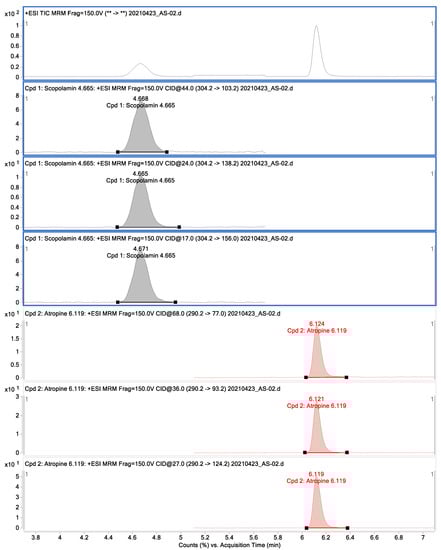 The study conducted by Vuković et al. [44] pointed out that the addition of formic acid to the mobile phase improved ionization efficiency and gave the studied tropane alkaloids a finer peak. The multiple reaction monitoring chromatograms and mass spectra of investigated TAs transitions are given in Figure 2. The retention time (Rt) of atropine was 9.63 min, while the Rt of scopolamine was 8.42 min.