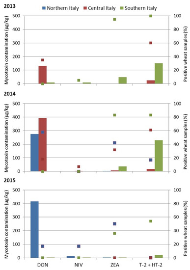 In 2014, wheat from Northern and Central Italy was mostly contaminated by DON, at average values of 275 and 393 µg/kg, respectively. Additionally, in this year, NIV was rare, while all Italian wheat samples were contaminated by ZEA, although with low values of 4, 8 and 37 µg/kg in Northern, Central and Southern Italy, respectively. Similarly, T-2 and HT-2 were detected in all Italian samples, with a high mean value in Southern Italy, 231 µg/kg.