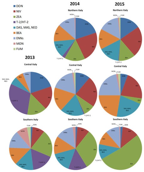 The graphs show a wide risk of multi-mycotoxin contamination in Italian durum wheat. Many mycotoxins are always present in the three years and in the different geographical areas, except for Northern Italy in 2013, but it was possible to distinguish specific risk in Italy. In particular, DON risk is high in Northern and Central Italy, while it is negligible in Southern Italy. Nivalenol risk is always present, although more in Northern and Central Italy and in lower percentage in Southern Italy. On the contrary, ZEA, always present too, is more evident in Southern Italy. The risk of T-2 and HT-2 toxins is negligible in Northern Italy, high in Southern Italy, and variable in Central Italy, depending on the years. The risk linked to the other minor mycotoxins, such as ENNs, BEA, DAS, MAS, and NEO, is also present in all the geographical areas and in all years. Negligible risk is related to MON and FUM in Italian durum wheat.
