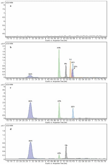 - Mackay, N.; Marley, E.; Leeman, D.; Poplawski, C.; Donnelly, C. Analysis of Aflatoxins, Fumonisins, Deoxynivalenol, Ochratoxin A, Zearalenone, HT-2 and T-2 toxins in Animal Feed by LC-MS/MS Using Cleanup with a Multi-Antibody Immunoaffinity Column. J. AOAC Int. 2022, 105, 1330–1340. [Google Scholar] [CrossRef]