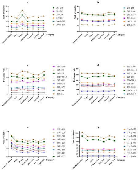 | Mycotoxins | Product Ions (m/z) | Internal Standards | Product Ions (m/z) |