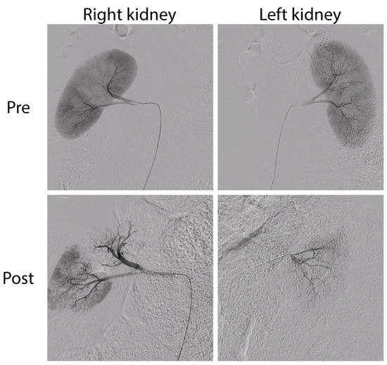 Contrast arteriogram before (Pre, top) and after (Post, bottom) embolization of the right (left panels; subtotal embolization) and left (right panels; complete embolization) kidney.