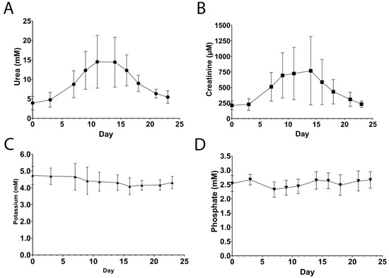 Urea (A), creatinine (B), potassium (C) and phosphate (D) plasma concentrations after administration of gentamicin (day 0). Data are presented as mean ± SD, n = 10 administrations in n = 5 animals. Linear imputation was used for missing plasma concentrations.