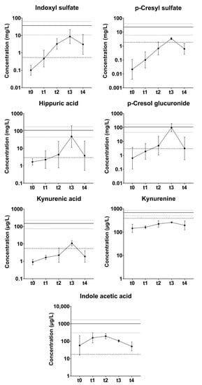 Plasma concentrations of protein bound uremic toxins (PBUTs) pre-embolization (n = 5, t0) and during gentamycin-induced acute kidney injury in pigs (n = 5, pre-gentamicin (t1); n = 4, week 1 (t2); n = 2, week 2 (t3); n = 5, week 3+ (t4)). Data are presented as mean ± SD. The striped line denotes the average concentration in healthy human adults, whereas the solid line and dotted lines denote the mean and SD, respectively, in ESKD patients [11,12].