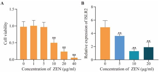 Effects of ZEN on cell viability and ISLR2 expression. (A) Detection of cell viability of cells exposed to different doses (0, 1, 5, 10, 20, 40 μg/mL) of ZEN. (B) ISLR2 expression changes in cells exposed to different doses (0, 5, 10, 20 μg/mL) of ZEN for 48 h. Different color of bars represents different concentration of ZEN. Data are presented as mean ± SD. Significance compared with control, ** p < 0.01.