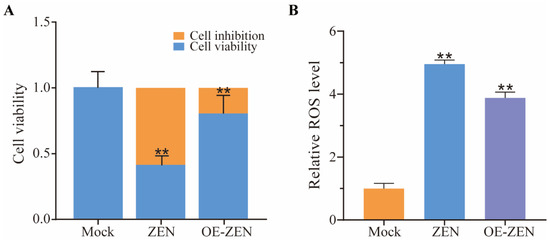 Effects of ISLR2 overexpression on ZEN-induced cytotoxicity and oxidative stress. (A) Detection of cell viability in the Mock, ZEN, and OE-ZEN groups. (B) Relative ROS levels in the Mock, ZEN, and OE-ZEN groups. Mock, cells without ZEN treatment; ZEN, cells exposed to 10 μg/mL ZEN; OE-ZEN, cells overexpressing ISLR2 and exposed to 10 μg/mL ZEN. Data are presented as mean ± SD. Significance compared with control, ** p < 0.01.
