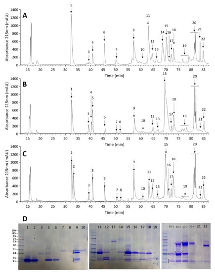 - Creer, S.; Malhotra, A.; Thorpe, R.S.; Stöcklin, R.S.; Favreau, P.S.; Hao Chou, W.S. Genetic and ecological correlates of intraspecific variation in pitviper venom composition detected using matrix-assisted laser desorption time-of-flight mass spectrometry (MALDI-TOF-MS) and isoelectric focusing. J. Mol. Evol. 2003, 56, 317–329. [Google Scholar] [CrossRef] [PubMed]