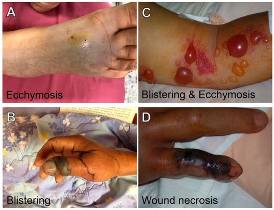 - Mao, Y.C.; Liu, P.Y.; Chiang, L.C.; Lee, C.H.; Lai, C.S.; Lai, K.L.; Lin, W.L.; Su, H.Y.; Ho, C.H.; Doan, U.V.; et al. Clinical manifestations and treatments of Protobothrops mucrosquamatus bite and associated factors for wound necrosis and subsequent debridement and finger or toe amputation surgery. Clin. Toxicol. 2020, 59, 28–37. [Google Scholar] [CrossRef] [PubMed]