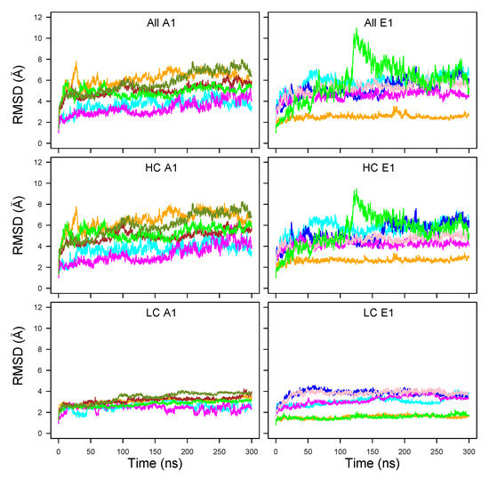 Very flat and low profiles around 2-4 Å were observed for the light chain (LC, bottom row), whereas the RMSD calculated on the heavy chain (HC, middle row) dominated the total RMSD values. The RMSD values for LC were in the range 2–4 Å for A1 whereas, for E1, some RMSD curves were smaller than 2 Å, and others were in the range of 3–4 Å. The LC, composed mostly of the catalytic domain, thus displayed a stable conformation.