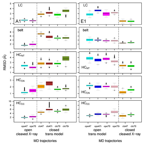Nevertheless, protonation effects could possibly play a role. Indeed, in analogy with the conformational transition observed experimentally at an acidic pH value of 5.0 for TeNT [11], one may conceive that the open form of A1 at pH 7.0 (magenta curve) would be more stable than at pH 4.7 (cyan curve); meanwhile, to the contrary, the closed form of E1 would be more stable at pH 4.7 (orange curve) than at pH 7.0 (green curve). Actually, this is what was observed for the HC RMSD in Figure 2, comparing the A1 magenta and cyan curves (A1ope70 vs. A1ope47) and the E1 orange and green curves (E1clo47 vs. E1clo70), respectively. To resume, two factors contributed to the protein internal stability: artifacts of the homology modeling templates, as well as protonation effects, which shift the equilibrium toward one or the other conformation of the protein.
