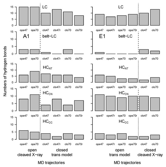 Number of hydrogen bonds between domains of the botulinum toxins A1 and E1, calculated in the 150–300 ns interval of trajectories. Long-range hydrogen bonds were detected along the trajectories by analyzing each frame every 0.2 ns, using the python package MDAnalysis [37,38]. The numbers of hydrogen bonds were calculated as those present more than 60% of the time and separated by more than 10 residues in the sequence. The dashed lines mark the separation between open and closed states; see Figure 3.
