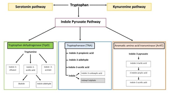 - Kumar, A.; Sperandio, V. Indole Signaling at the Host-Microbiota-Pathogen Interface. mBio 2019, 10, e01031-19. [Google Scholar] [CrossRef]