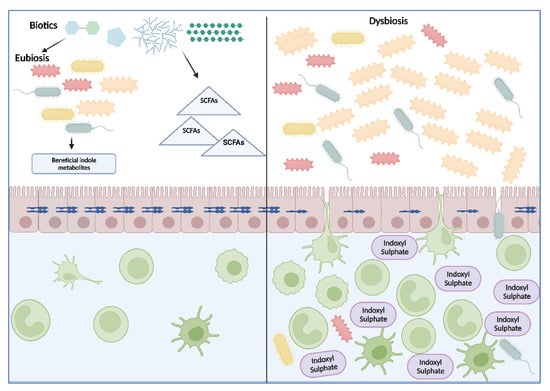 | IS | Roles in cardiovascular disease, inflammation, kidney and heart fibrosis, neurotoxicity, disturbed drug removal, and chronic kidney disease-mineral and bone disorder (CKD-MBD) [61,97,98] | Deleterious for intestinal homeostasis, promotes increased intestinal epithelial barrier disruption, contributing to endotoxemia [22] |