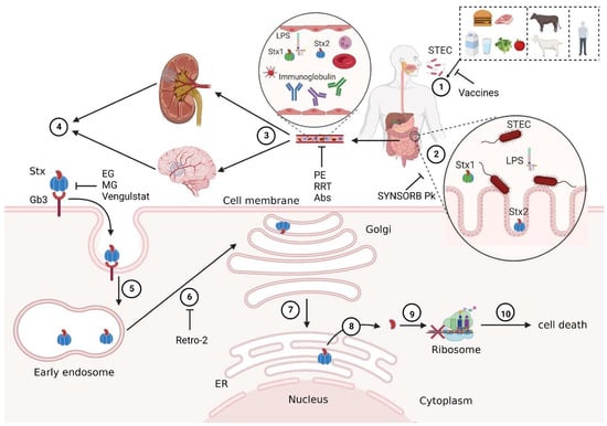 Schematic diagram of STEC-HUS pathogenesis and therapeutic targets. ① Human infection with Shiga toxin-producing Escherichia coli (STEC) may occur through contact with contaminated food, water, livestock, or infected patients. ② STEC travels with contaminated water and food to the gastrointestinal tract and colonizes the surface of the intestine, and the virulence factors of STEC such as Stx1, Stx2, and LPS are released in the intestinal lumen. ③ Stxs, which are the main virulence factors of STEC, enter the blood circulation through the damaged intestinal tract and are transported to the main target organs (kidney and nervous system). ④ Stx recognizes Gb3Cer on the surfaces of target cell membranes and induces cell endocytosis. ⑤ Subsequently, Stx enters the early endosome, ⑥ reaches the trans-Golgi network through retrograde transport pathway, ⑦ and is then transported to the endoplasmic reticulum (ER). ⑧ An Stx A1 fragment, with enzymatic activity, is released into the cytoplasm, ⑨ A1 inhibits protein synthesis by cleaving an adenine residue from the 28S RNA of the 60S ribosomal subunit, ⑩ leading to cell death and ultimately resulting in the dysfunction of corresponding target organs. Some potential preventive and therapeutic strategies work by blocking different pathogenic processes. For example, vaccines may reduce STEC infections; SYNSORB Pk may absorb Stxs in the intestinal tract; plasmapheresis (PE), renal replacement therapy (RRT), and antibodies (Abs) may clear Stxs and other virulence factors in the blood; eliglustat (EG), miglustat (MG), and venglustat may inhibit Gb3Cer synthesis and prevent Stxs from binding to Gb3Cer; Retro-2 may block the toxicity of Stxs by blocking their retrograde transport. Created with BioRender.com (accessed on 12 October 2022).