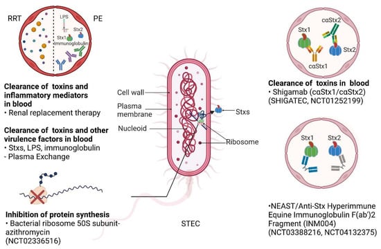 The production of Stxs by STEC and potential therapeutic strategies. Stxs are synthesized and released from STEC. Multiple therapeutic strategies available in the clinic or in clinical trials could be utilized for STEC-HUS. Renal replacement therapy (RRT) may clear the toxins and inflammatory factors in the blood; plasma exchange (PE) may clear Stxs and virulence factors in the blood in the early stages of STEC infections. There are a number of therapies targeting Stxs that are in clinical trials. Azithromycin may be applied to inhibit protein synthesis by targeting bacterial ribosomal 50S subunits (NCT02336516). Shigamabs (cαStx1 and cαStx2) are antibodies that may bind, neutralize, and clear Stxs in the blood (SHIGATEC and NCT01252199); neutralizing equine anti-Shiga toxin (NEAST) are anti-Stx hyperimmune equine immunoglobulin F(ab’)2 fragments that may also neutralize and clear Stxs in the blood (NCT03388216 andNCT04132375). Created with BioRender.com (accessed on 22 December 2022).