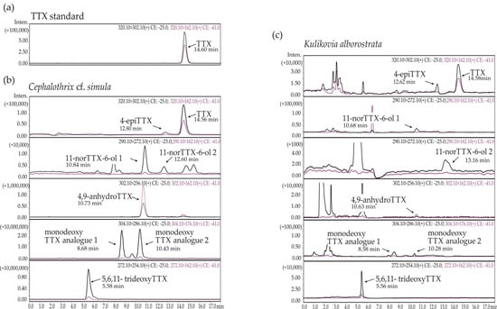Representative high-performance liquid chromatography–tandem mass spectrometry (HPLC–MS/MS) chromatograms of (a) tetrodotoxin (TTX) standard and (b)TTX and its analogues from Cephalothrix cf. simula, and (c) Kulikovia alborostrata. The black and red lines represent two different mass transitions (described in each chromatogram).