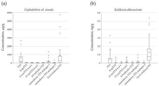 Box and whisker plot representing the mean and median TTXs concentrations of (a) Cephalothrix cf. simula (n = 32) and (b) Kulikovia alborostrata (n = 36). Lower and upper box boundaries represent 25th and 75th percentiles, respectively; lines inside represents box median; lower and upper error lines reflect the variability outside these percentiles; asterisks (*) indicate outlying values; and an x mark indicates the mean value.