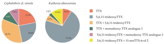 In the present study, a wide variation in TTXs concentrations have been observed in extracts of C. cf. simula and K. alborostrata. The overlaps of the TTXs compositions of the two species may indicate that both accumulate (at least some part of) toxins from several common sources, including their own microbiomes and/or preferred diet. The obtained TTXs profiles and those reported in the literature have been compared; and as a result, the assumption has been made that TTXs profiles are specific for each region. Further investigations of toxin profiles of different organisms are expected to elucidate the migration pathways of TTXs and its analogues in ecosystems.