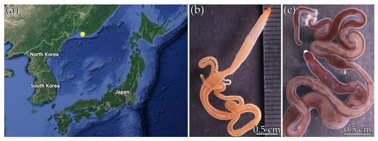 Cephalothrix cf. simula (32 specimens) and Kulikovia alborostrata (36 specimens) were obtained from rhizoids of the biennial brown alga Saccharina sp., collected at a depth of 0.5–1.5 m in Spokoynaya Bay, Peter the Great Bay, Sea of Japan (42.7090° N, 133.1809° E), in May–August 2020 (Figure 4). After collection, the rhizoids were moved to the Vostok Marine Biological Station of the A.V. Zhirmunsky National Scientific Center of Marine Biology, Far Eastern Branch, Russian Academy of Sciences (Vladivostok, Russia) and placed in tanks with seawater at 20 °C, and kept there until nemerteans came out of them. The nemertean species were identified based on morphological characters, by Dr. Alexey V. Chernyshev, an expert in nemertean biology from the A.V. Zhirmunsky National Scientific Center of Marine Biology. Before extraction, the animals were kept in tanks, with aerated seawater at 17 °C.