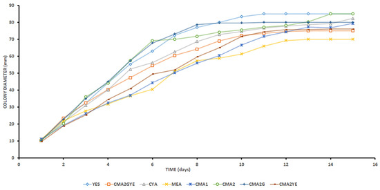 The mean colony diameter of Aspergillus parasiticus grown on YES (yeast extract sucrose agar), MEA (malt extract agar), CYA (Czapek yeast agar), CMA1 (cooked meat agar 1), CMA2 (cooked meat agar 2), CMA2G (CMA2 supplemented with 1% glucose), CMA2YE (CMA2 supplemented with 0.2% yeast extract), and CMA2GYE (CMA2 supplemented with 1% glucose and 0.2% yeast extract) during 15 days of incubation at 25 °C.
