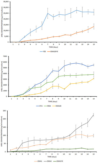 AFB1 production kinetics was different on meat-based media simulating the composition of dry-fermented meat products (CMA2GYE) and microbial culture media (YES and MEA) (Table 1). Thus, it seems essential to evaluate food-borne mycotoxigenic fungi on food-based substrates.