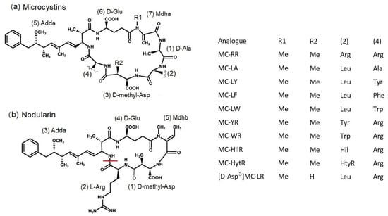 Generalized structure of (a) MCs and (b) NOD highlighting substituents present in analogues targeted in this study. Leu—Leucine, Arg—Arginine, Ala—Alanine, Tyr—Tyrosine, Hil—Homoisoleucine, Trp—Tryptophan, Phe—Phentylalanine, Me—Methyl, HtyR—Homotyrosine. Cyclic NOD-R structure shown, highlighting bond broken for hydrolysis to [seco-2/3] NOD (also known as linear nodularin).