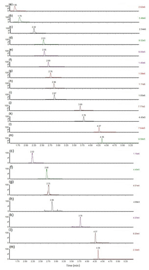 Total ion chromatograms summing SRM transitions (no mass spectral smoothing) for MCs and NOD in calibration standard (left) and mussel matrix RM (right), with peaks labelled as: (a) [D-Asp3]MC-RR (513 > 103; 135) (b) MC-RR (520 > 102.8; 1345 (c) NOD-R (825.5 > 135; 103) (d) MC-YR (1045.6 > 135; 127) (e) MC-HtyR (1059.6 > 135; 107) (f) MC-LR (995.6 > 135; 127) (g) dmMC-LR ([D-Asp3]MC-LR and/or [Dha7]MC-LR (981.5 > 135; 107)) (h) MC-HilR (1009.7 > 135; 127) (i) MC-WR (1068.6 > 134.9; 107) (j) MC-LA (910 > 135; 107) (k) MC-LY (1002.5 > 135; 107) (l) MC-LW (1025.5 > 135; 126.8) (m) MC-LF (986.5 > 135; 213).