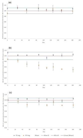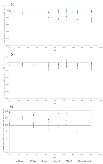 Cyanotoxin concentrations determined in crude extracts of wet RM tissues normalized to mean of time zero (n = 6) over 181-day stability experiment, showing effects of RM storage in freezer (FZ; −20 °C) and fridge (FR, +4 °C) for (a) NOD-R (b) MC-LR (c) MC-LY (d) MC-LF (e) MC-LW (f) dmMC-LR. Max = mean at time zero plus three times the standard deviation (n = 6); min = mean at time zero minus three times the standard deviation (n = 6).